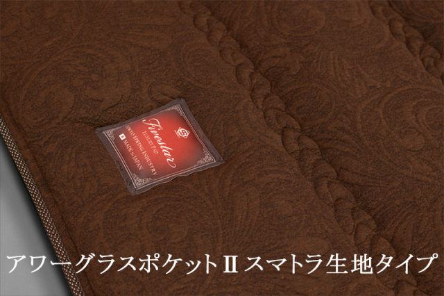 こちらのダークブラウンの「ファイブスター」は、「アワーグラスポケットⅡスマトラ」マットレスに使われている、こだわりの特注ダブルニット生地を使用して作りました。